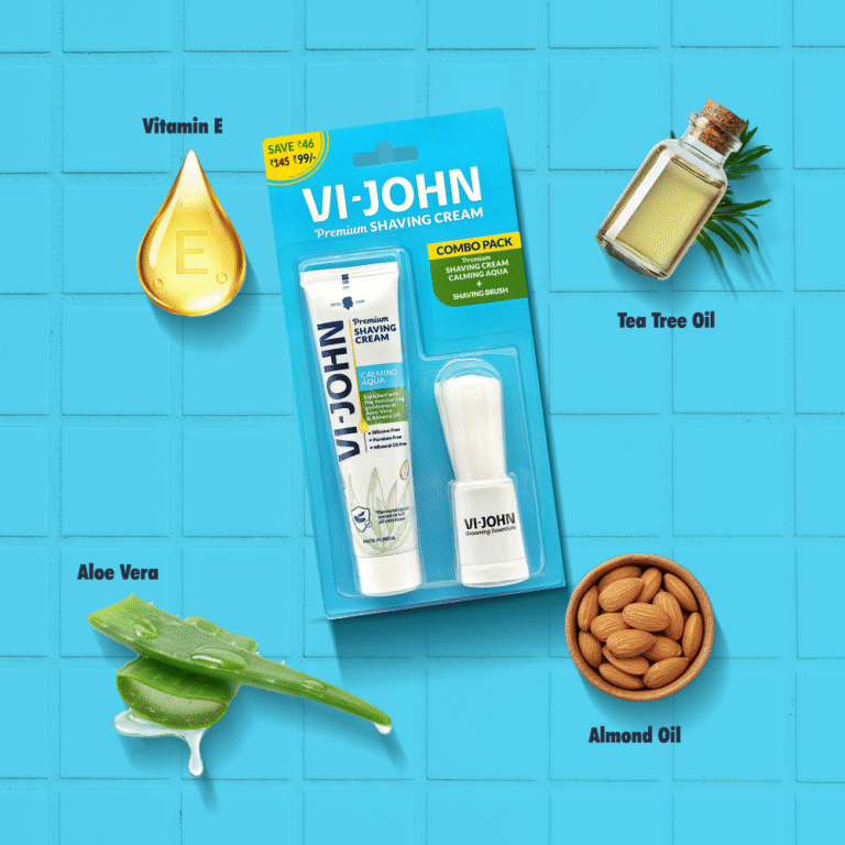 VI-JOHN Calming Aqua Shaving Cream with Brush Combo | Enriched with Aloe Vera & Almond Oil | Smooth, Soothing, and Refreshing Shave