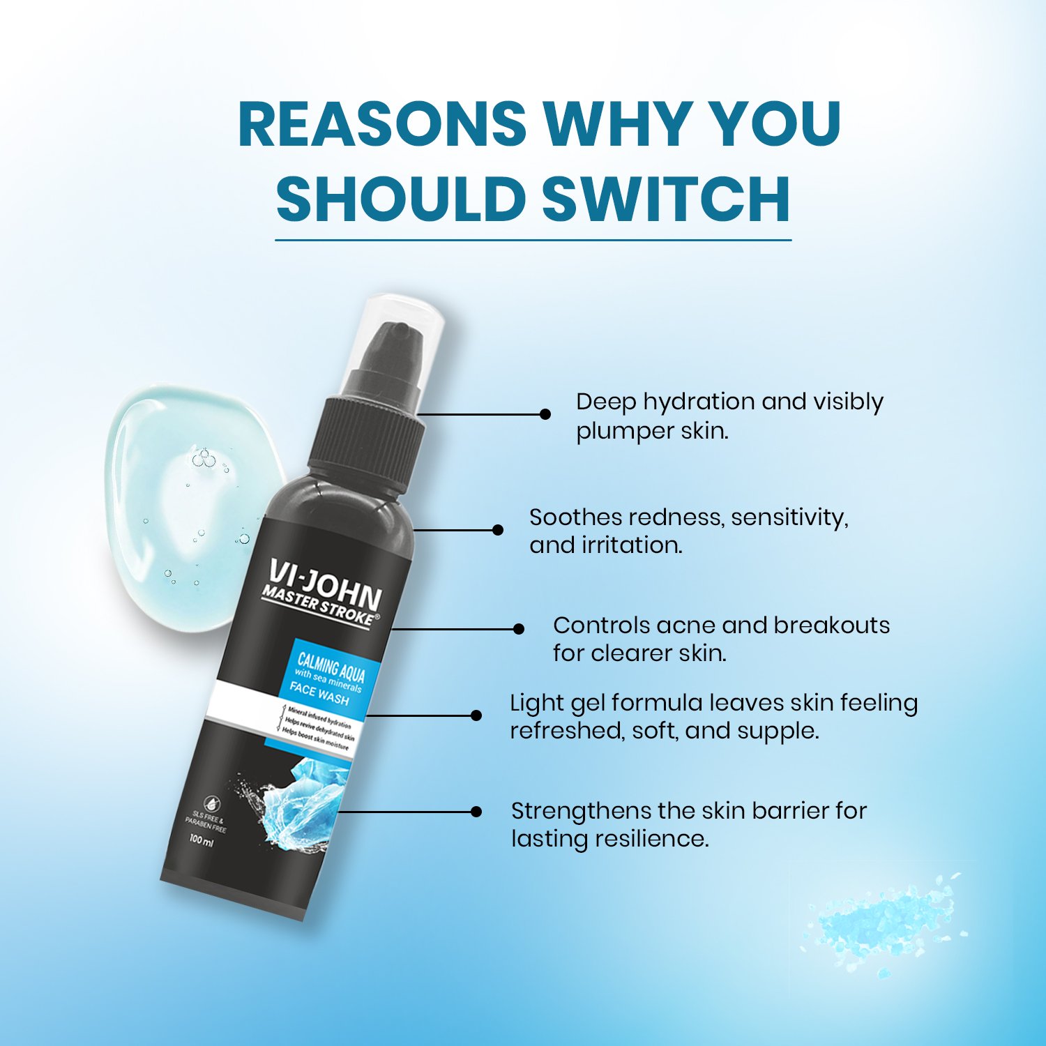 VI-JOHN Master Stroke Calming Aqua Face Wash for Pimples and Acne (100 ml) is specially crafted for men who want clear, healthy-looking skin without harsh dryness. Powered with soothing sea minerals and active cleansing agents, this advanced formula targets acne and pimples at the root while maintaining the skin’s natural moisture balance.